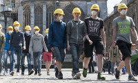 wie Denkmalpfleger mit Maske und Helm nahmen die Schüler